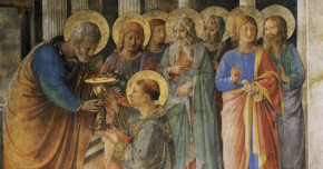 of St. Sixtus, and early Pope and martyr, tells of St. Lawrence and the other six Deacons of Rome following and crying
